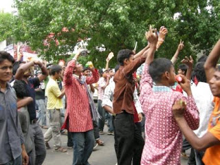De mest inbitna börjar fira klockan 6 på morgonen, men vi tog det lite lugnare och gav oss utanför dörren vid 7. Efter en timme i trafiken var vi framme vid vår vän Sangidas hus. Där fick vi frukost, mötte upp med två andra vänner (Tanzim, vår bengalilärares släkting, och en av Sangidas vänner) och begav oss sedan ut på stan.